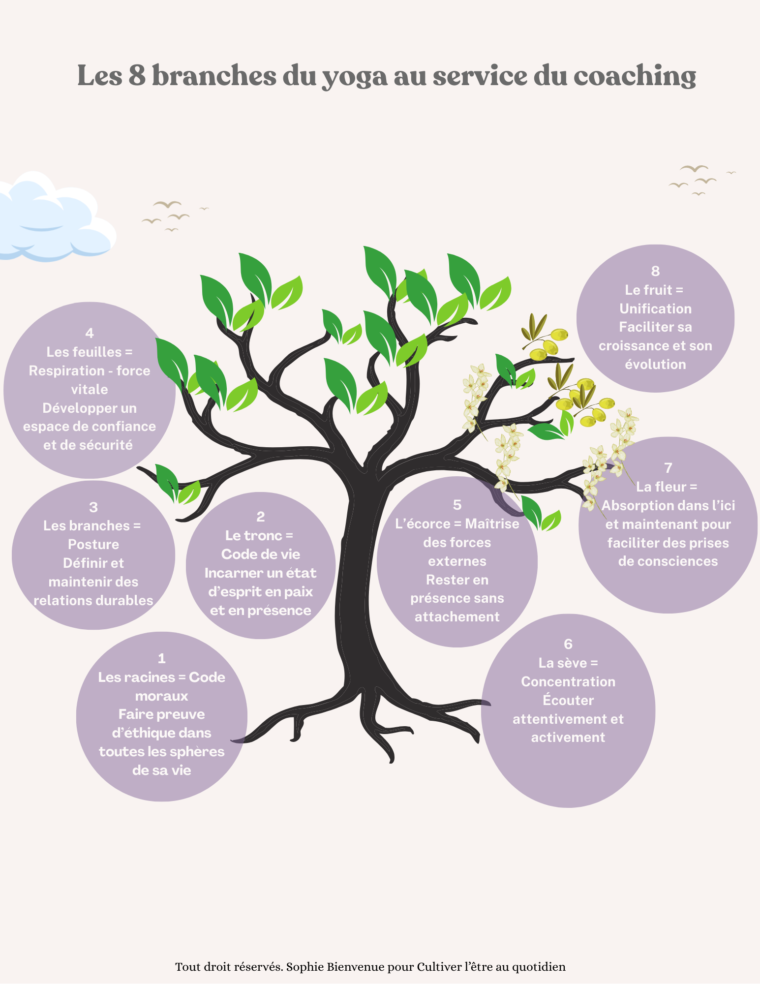 À travers l’exploration des 8 branches du yoga, la démarche d’accompagnement proposé permet de prendre de la hauteur sur sa façon d’être, dans tous les aspects du quotidien et sortir du pilotage automatique. Elle offre la possibilité de se placer en observateur neutre et créer de l’espace entre des situations parfois complexes de sa vie pour trouver des solutions innovantes. Elle est propice à une mise à plat de ses comportements, de ses besoins et de ses aspirations, tout en mettant en lumière, pas à pas, le meilleur chemin pour créer une vie plus souveraine, épanouissante et à son image.